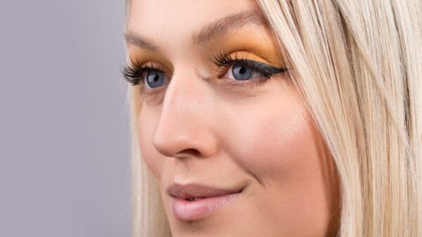 6. Konzentrieren wir uns jetzt auf das Augen Make-up, das die Krönung eines jeden Looks ist. Ich habe für meinen perfekten Augen-Look den gelb-goldenen Lidschatten aus der Lidschattenpalette NYX Professional Makeup Ultimate und NYX Professional Makeup Ultimate Edit gewählt. Sind Sie kein ausgesprochener Fan von Gelb, greifen Sie zu einer anderen beliebigen Farbe. Denken Sie darüber nach, welche Farbe Ostern evoziert, für das Osterfest typisch ist und zugleich mit Ihrer Augenfarbe harmoniert. Verteilen Sie mit dem Rundpinsel den gewählten einfarbigen Lidchatten über das ganze Lid und verblenden Sie übergangslos die Pigmentierung. Nehmen Sie einen Flachpinsel für Lidschatten zur Hand und verwenden Sie einen glitzernden Lidschatten oder einen ähnlichen Farbton, den Sie auf das bewegliche Lid auftragen. Zum Schluss tragen Sie einen hellbraunen Lidschatten auf das untere Lid entlang des unteren Wimpernkranzes.