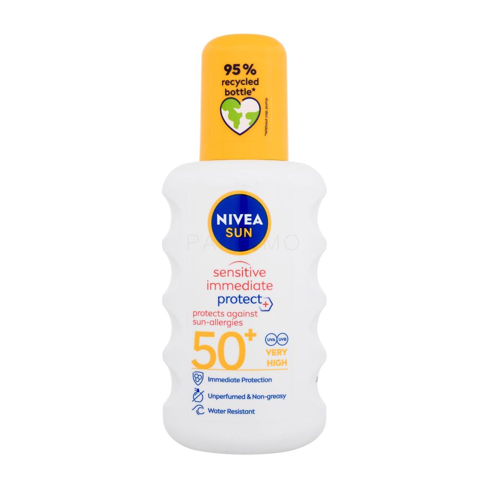 Holen Sie sich einen Sonnenbrand, sobald Sie in der Sonne erscheinen? Jede Haut benötigt einen effektiven Sonnenschutz und sehr empfindliche Haut erste recht! Das Sonnenschutzspray Nivea Sun Sensitive Immediate Protect+ Sun-Allergy SPF50 wird Ihr unentbehrlicher Begleiter in den Sommermonaten, oder bei jedem Aufenthalt in den Bergen. Das Sonnenschutzspray bietet einen hohen, sofort wirksamen UVA/UVB-Schutz gegen Sonnenbrand und hilft das Risiko verschiedener sonnenbedingter Allergien zu reduzieren.