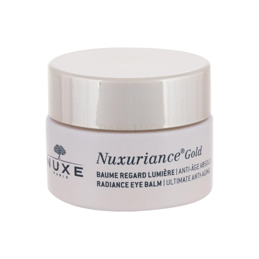 Der nährende und hautglättende Augenbalsam Nuxe Nuxuriance Gold Radiance Eye Balm wurde mit pflanzlichen Inhaltsstoffen und goldfarbenen Mikropartikelchen angereicht. Er schenkt der Haut eine natürliche Leuchtkraft und ein jugendliches Erscheinungsbild zurück. Der Anti-Aging-Balsam verbessert die Spannkraft der Haut und verleiht ihr den zarten Duft von weißen Blumen und Sandelholz.